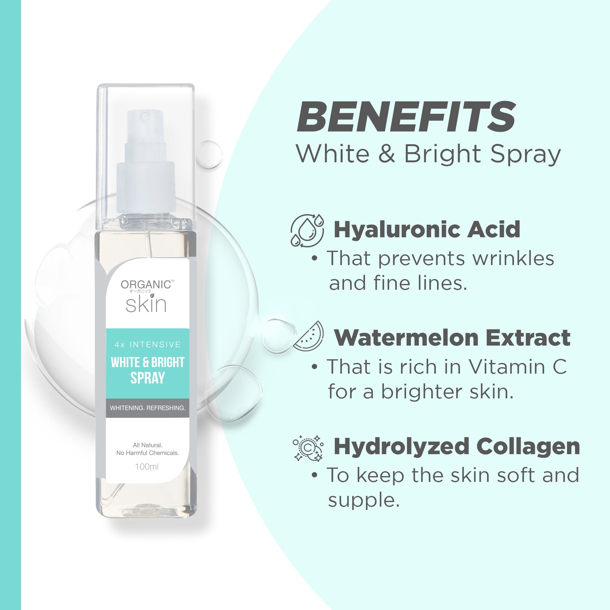ORGANIC SKIN JAPAN WHITE & BRIGHT SPRAY is the efficient, on the go, Face Brightening product that refreshes dull, and tiresome skin. This product can be used and reapplied any time of the day to restore youthful glow. It replenishes nutrients, hydrates and locks in moisture to give your skin the boost to stay fresh all throughout the day.
